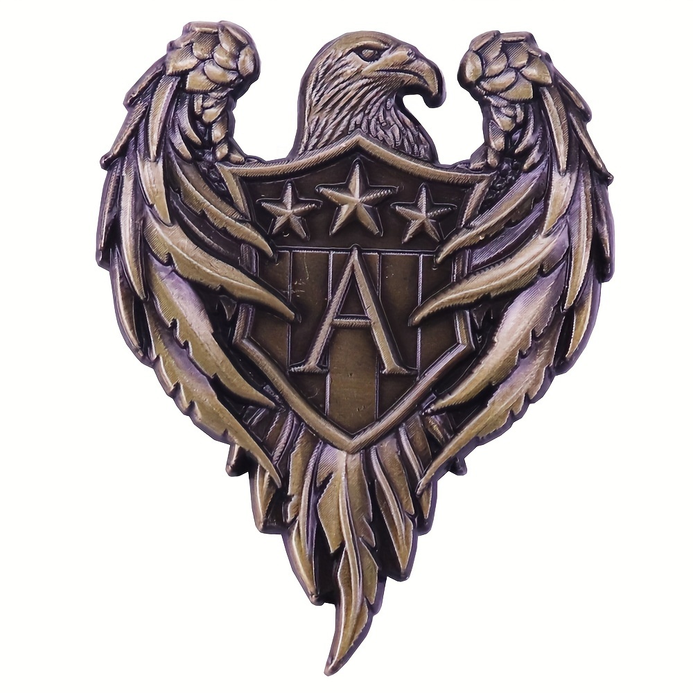 A bold, vintage-style tribute to American strength and pride, featuring a majestic bald eagle with outstretched wings, clutching a shield emblazoned with three stars and the letter "A". This brooch evokes the classic aesthetic of U.S. military and patriotic insignia, perfect for patriots, vintage collectors, and anyone who loves bold, symbolic jewelry.